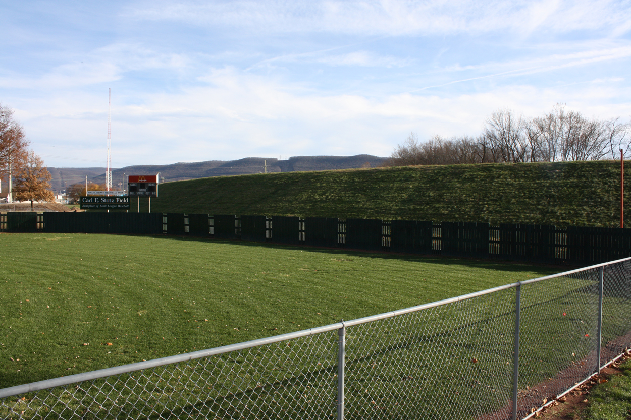 By 1942 the Lycoming Creek levee was completed, and Little League was once again able to use the earlier open space in Memorial Park. The towering levee wall at the site did present an obstacle for the creation of a Little League baseball field, but the growing organization was able to use the levee’s tall, sloped wall to their advantage, as it offered the perfect grassy stadium seating for Little League spectators. As Little League attracted more and more young players and spirited fans through the years, the large amount of available seating on the levee proved to be very useful.