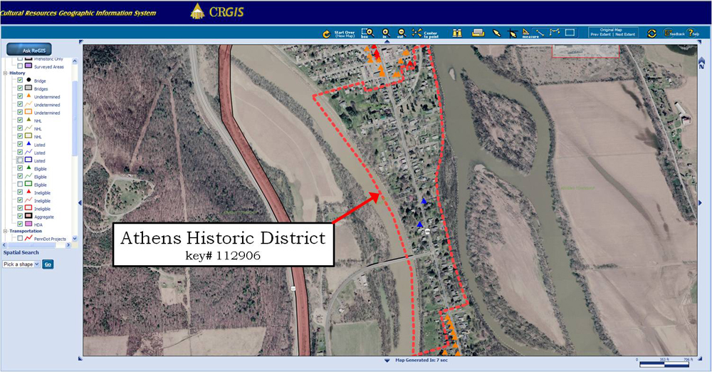 Listed in the National Register of Historic Places in 2004, the Athens Historic District is significant as a, “…well-preserved concentration of nineteenth and early twentieth century American residences, especially in the Greek Revival and Queen Anne styles. The district is one of the best preserved concentrations of dwellings in Bradford County, with very few intrusions or changes in land use.” Previously named Tioga Point, Athens was once the site of Native settlements, and the Revolutionary War era Fort Sullivan. By the 19th Century, Athens had become prominent in the lumber industry, carriage manufacturing, bridge building, and as a stop on the North Branch of the Pennsylvania Canal.