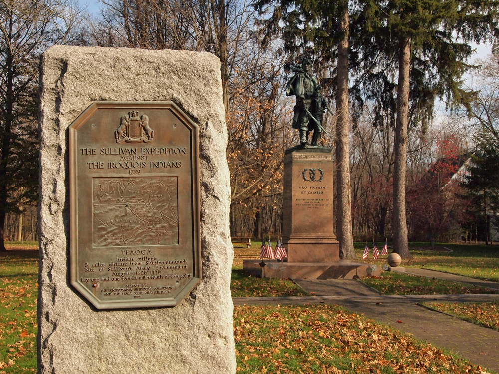 Across the street from the Tioga Point Museum is the former site of Athens Academy, a public school which stood there from 1814 to 1925, and included the famous early American songwriter Stephen Foster as one of its alumni. It is said that while a student in Athens, Foster paid homage to the town when he wrote the “Tioga Waltz”. Today the site is a park, and home to several historical markers and monuments. The most famous of these monuments is the “Protection of the Flag”. Constructed in 1902, and individually listed in the National Register in 2001, the monument was dedicated to veterans of the Civil War, but has come to honor all veterans. It is a significant local example of work by the nationally prominent design firm of McKim, Mead, & White, and sculptor George Thomas Brewster.