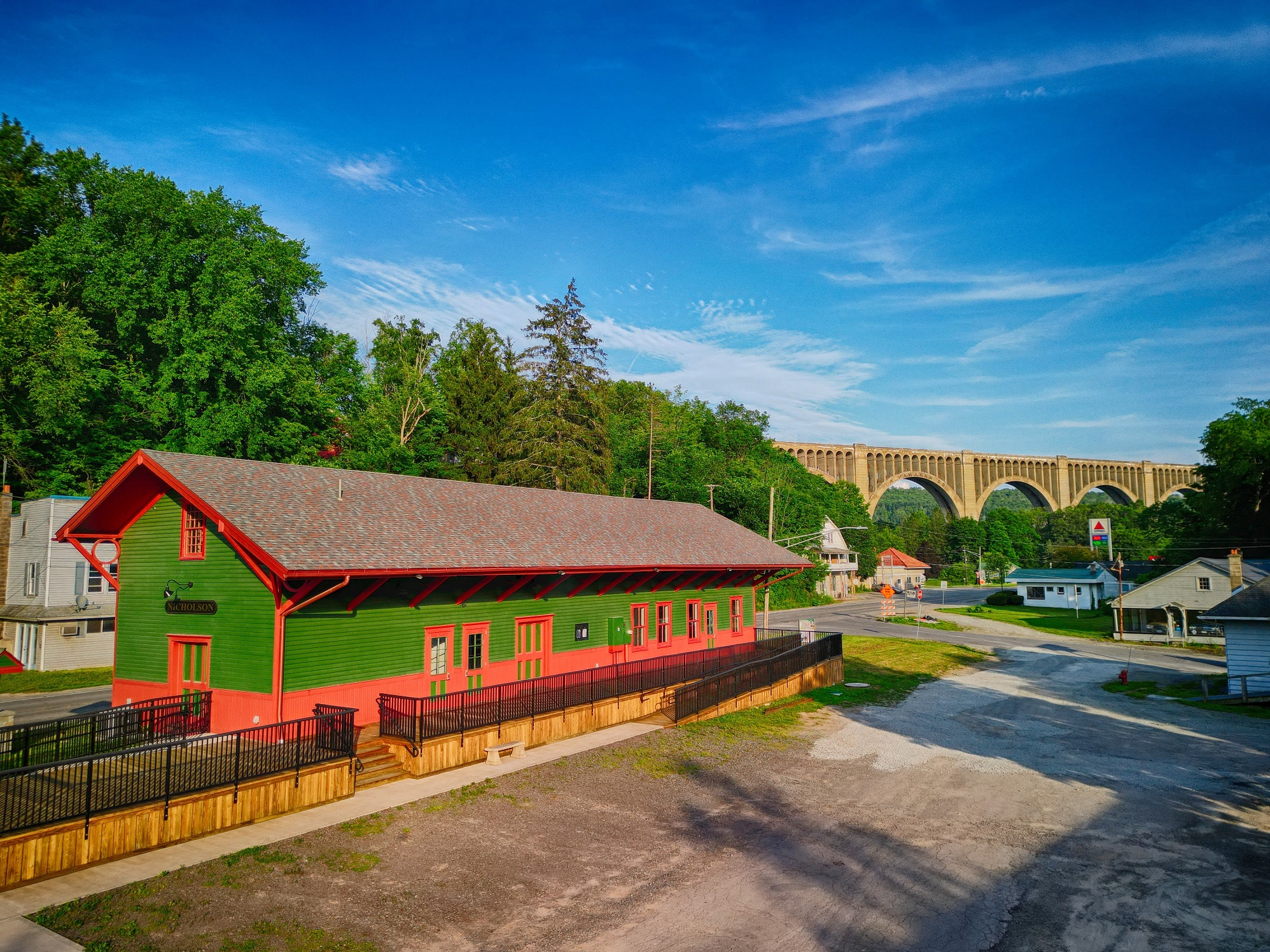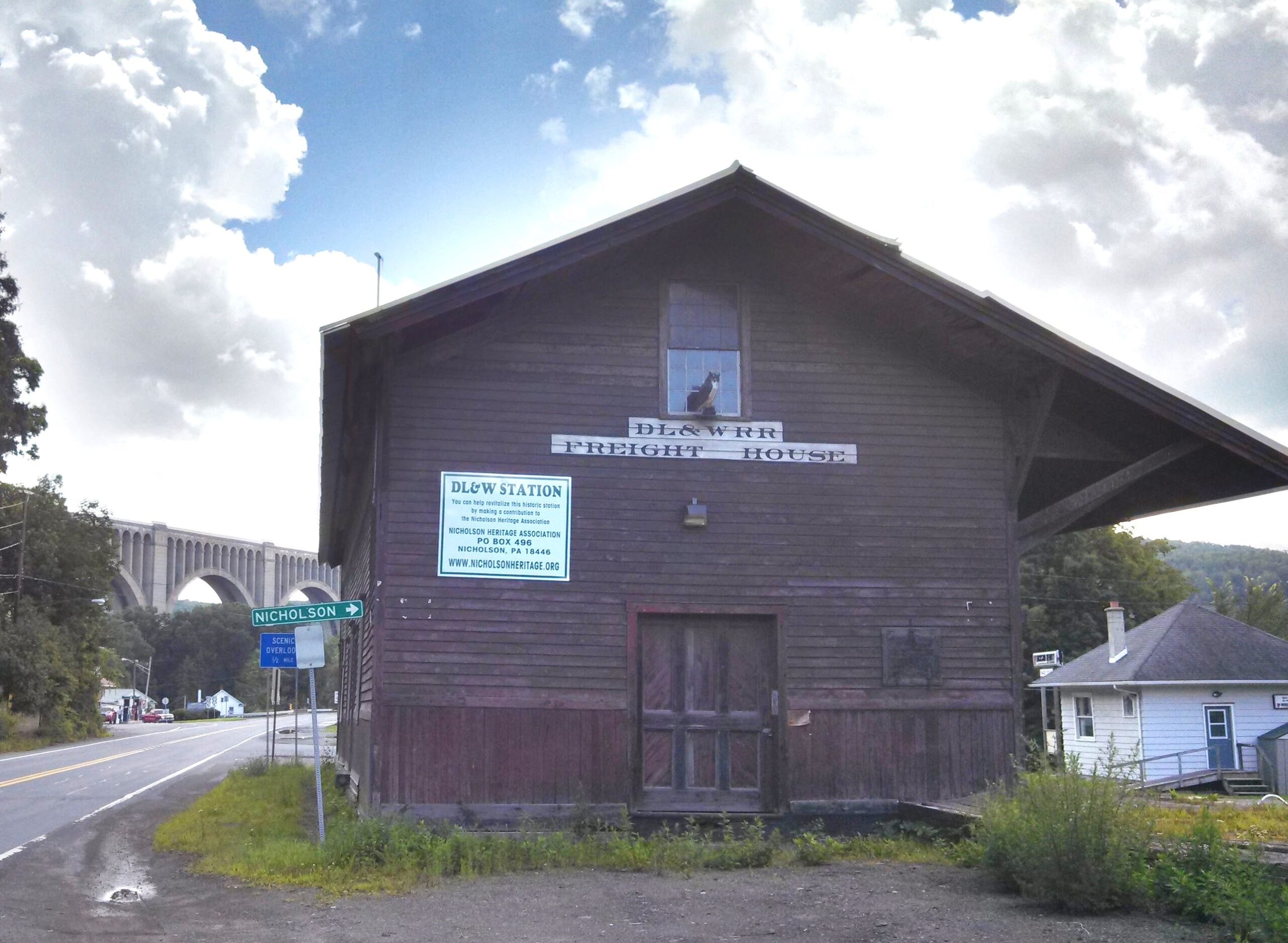 - The rehabilitated station, with the Tunkhannock viaduct in the background. Photo courtesy of Nicholson Heritage Association.