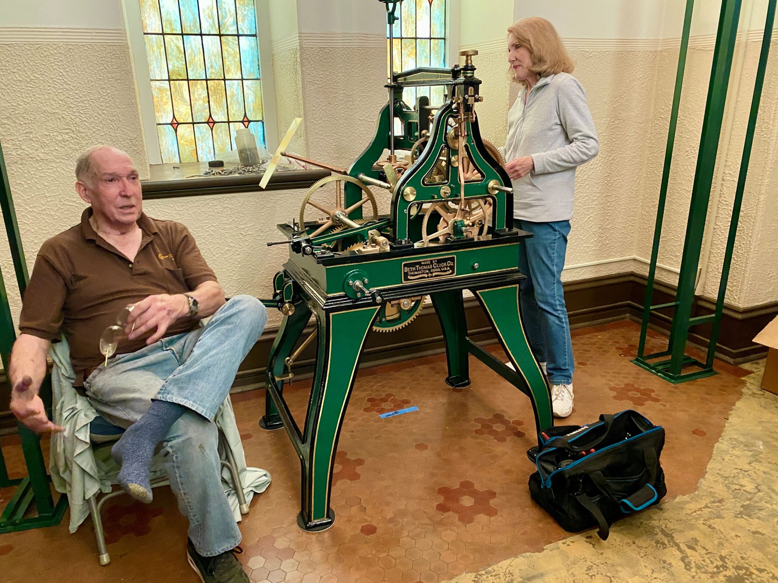 The restored clock mechanism is located just inside the church’s steeple doors, where visitors can see it in action. Photo from Huntingdon Presbyterian Church Facebook page, May 2024.