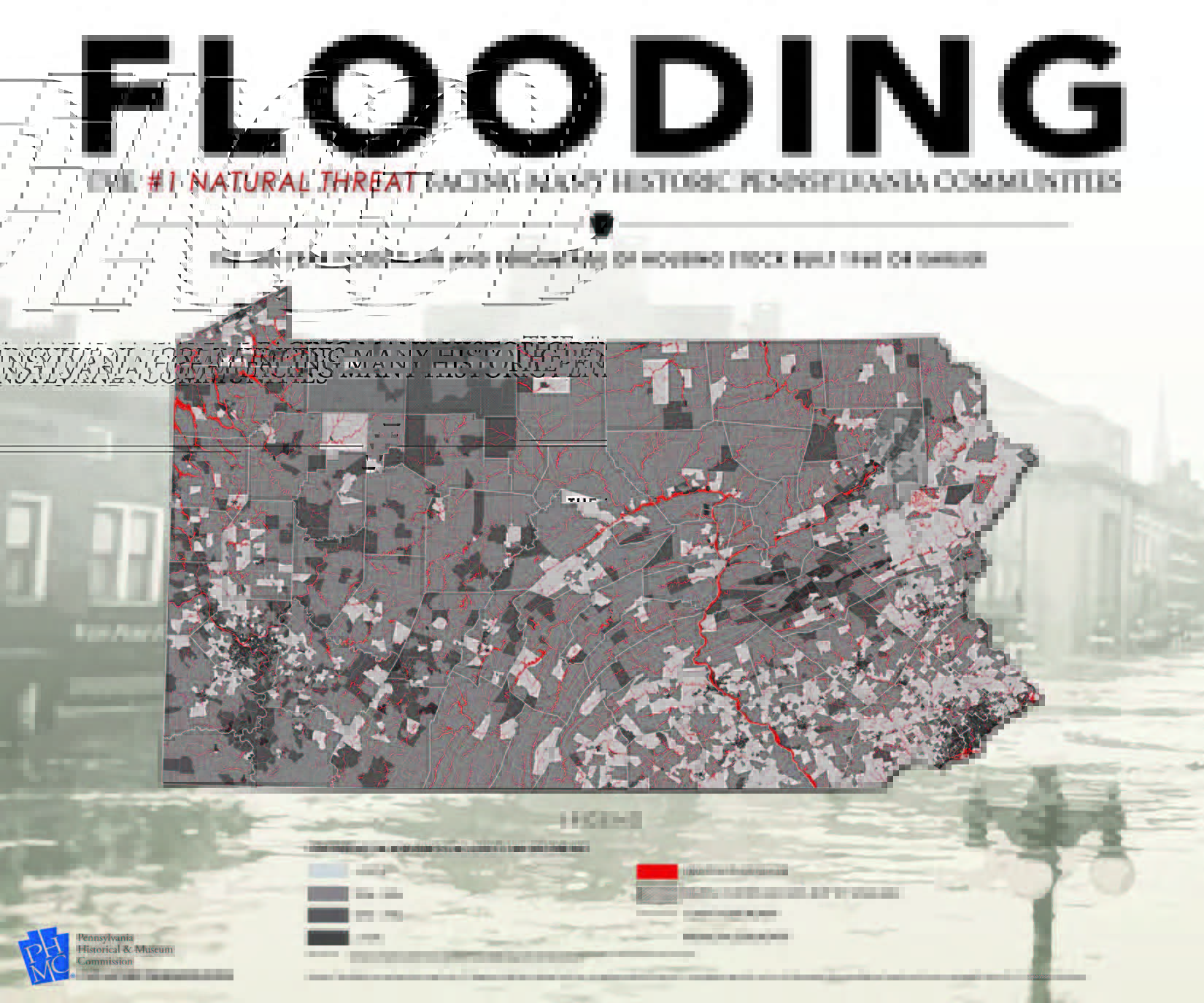 PHMC-SHPO_StatewideFloodRiskPercentHousingStock1960orEarlier_SmallPerhaps the main focal point of the exhibit, however, was its backdrop; an oversize poster titled “FLOODING: The #1 Natural Threat to Many Historic Pennsylvania Communities.” This poster highlights the location of the 100-year flood plains within the commonwealth and areas (U.S. Census block groups) delineated by the percentage of housing stock built prior to 1960.This poster’s primary intent is to create awareness about the intersection between flood hazard areas and potentially historic areas of our built environment—and to provoke thought about the need for historic resource survey in these areas. The map’s county and municipal boundaries allow readers to get a sense of the flood risk and the related potential impacts to historic properties within their own community.