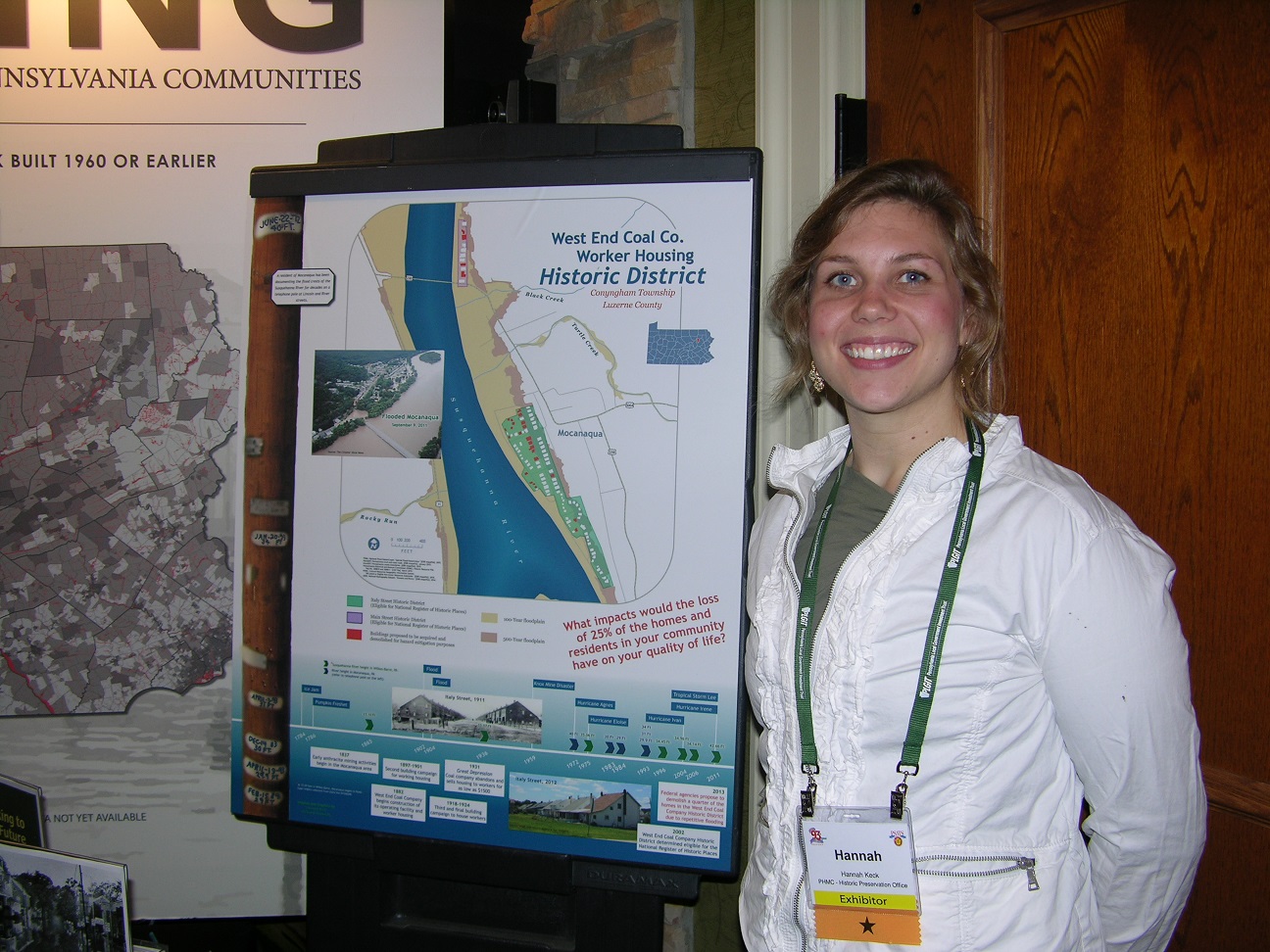 PA SHPO’s very own Spring 2015 T.H.I.S. (The Harrisburg Internship Semester) Intern Hannah Keck (Clarion University of Pennsylvania ’15) designed and exhibited a poster demonstrating the likely impacts of one flood mitigation alternative widely used by the Federal Emergency Management Agency—acquisition & demolition—on the flood-prone village of Mocanaqua in Conyngham Township, Luzerne County. Mocanaqua, which sees repetitive flooding due to its location along the shore of the Susquehanna River, was most recently ravaged by the floodwaters brought on by Tropical Storm Lee in the fall of 2011, and now has nearly 25% of its housing stock proposed for demolition to remove the structures from the floodplain.