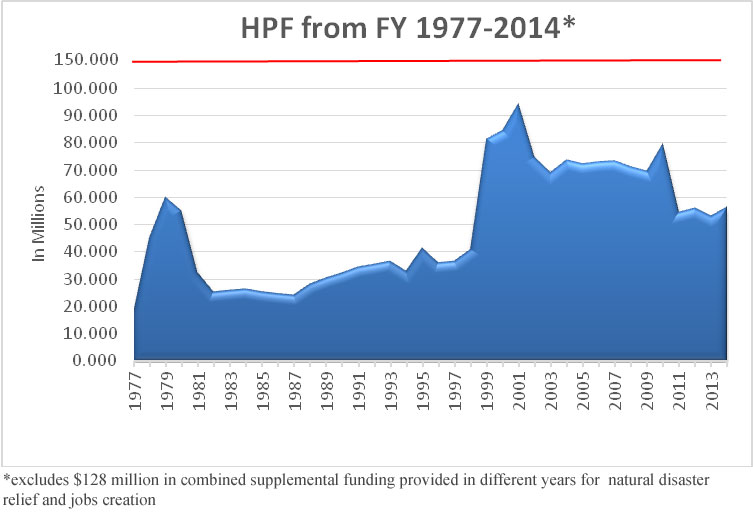 Appropriations history for the Historic Preservation Fund from 1977-2014. Used with permission from the National Conference of State Historic Preservation Officers.
