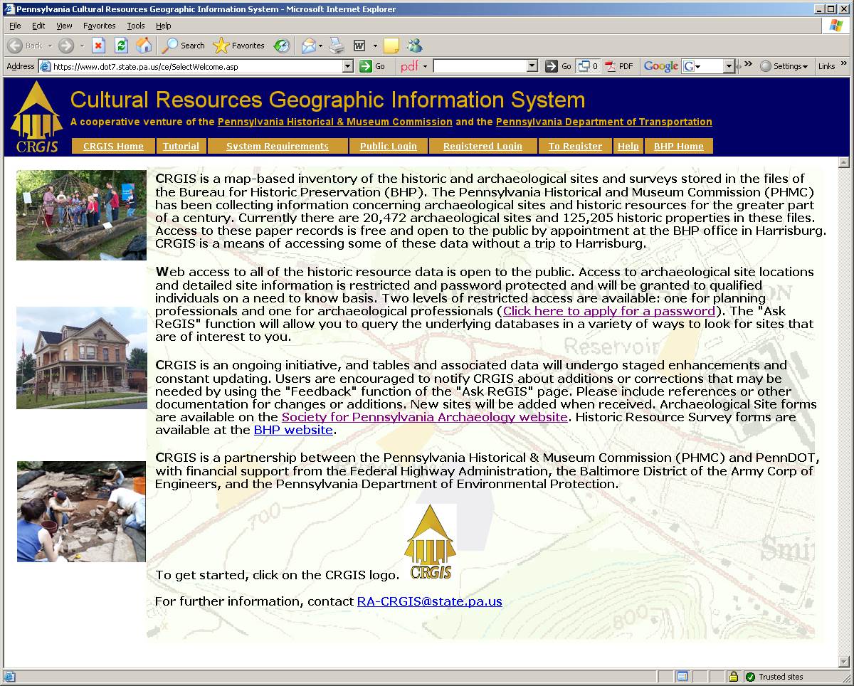 In the mid 1990s, PHMC entered into a partnership with PennDOT to make all of this information available through a Geographic Information System. We had data they needed and they had a way to display it. With assistance from the Baltimore District of the Army Corps of Engineers, CRGIS was developed as a way to share data among the three agencies to expedite project review. It was especially important to staff members in offices outside of Harrisburg who found it difficult and costly to travel to use the paper files. In the early 2000s it became an intranet web application and it was quickly determined that our interests could be better served if more people could access the information remotely. So GeoDecisions, the designer of the system, turned it into a public website, earning the company and the two agencies the Diamond Award for Engineering Excellence from the American Council of Engineering Companies of Pennsylvania (ACEC/PA) in 2005. The stated purpose of this annual award was “To recognize Pennsylvania engineering firms and their clients for the outstanding contributions which enhance the social and economic welfare of the Commonwealth of Pennsylvania.” We continue to be dedicated to this challenge and will continue to add to and change the CRGIS into the future. So stay tuned for more exciting changes.