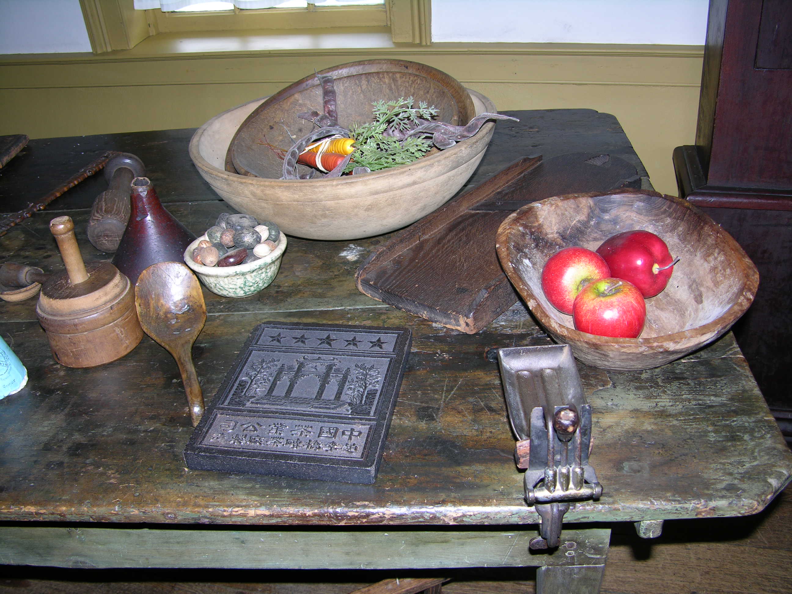 The main entrance to the museum is around the back of the house, where we found a discrete white addition housing a museum store. After paying for our tours, Keith and I followed the tour guide through the house and each outbuilding. Our guide told us about Philip Freeman, who built the log section of the inn, as well as the Armor family who added the stone section and operated the inn throughout the Turnpike era (circa 1820-1862). Much of the furniture and household goods, as well as a wide variety of other period goods, are from the Armor family period. Especially interesting were the blacksmith’s shop, with its full working furnace and bellows, and the barn, housing an authentic stagecoach and Conestoga wagon.