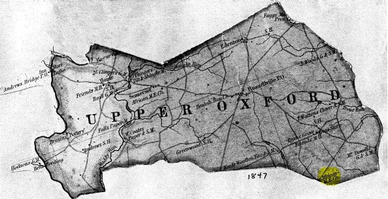 1847 Map of Upper Oxford Township in Chester County. The Hosanna Church is marked on the map as “African M.E. Church.” Here highlighted in yellow.