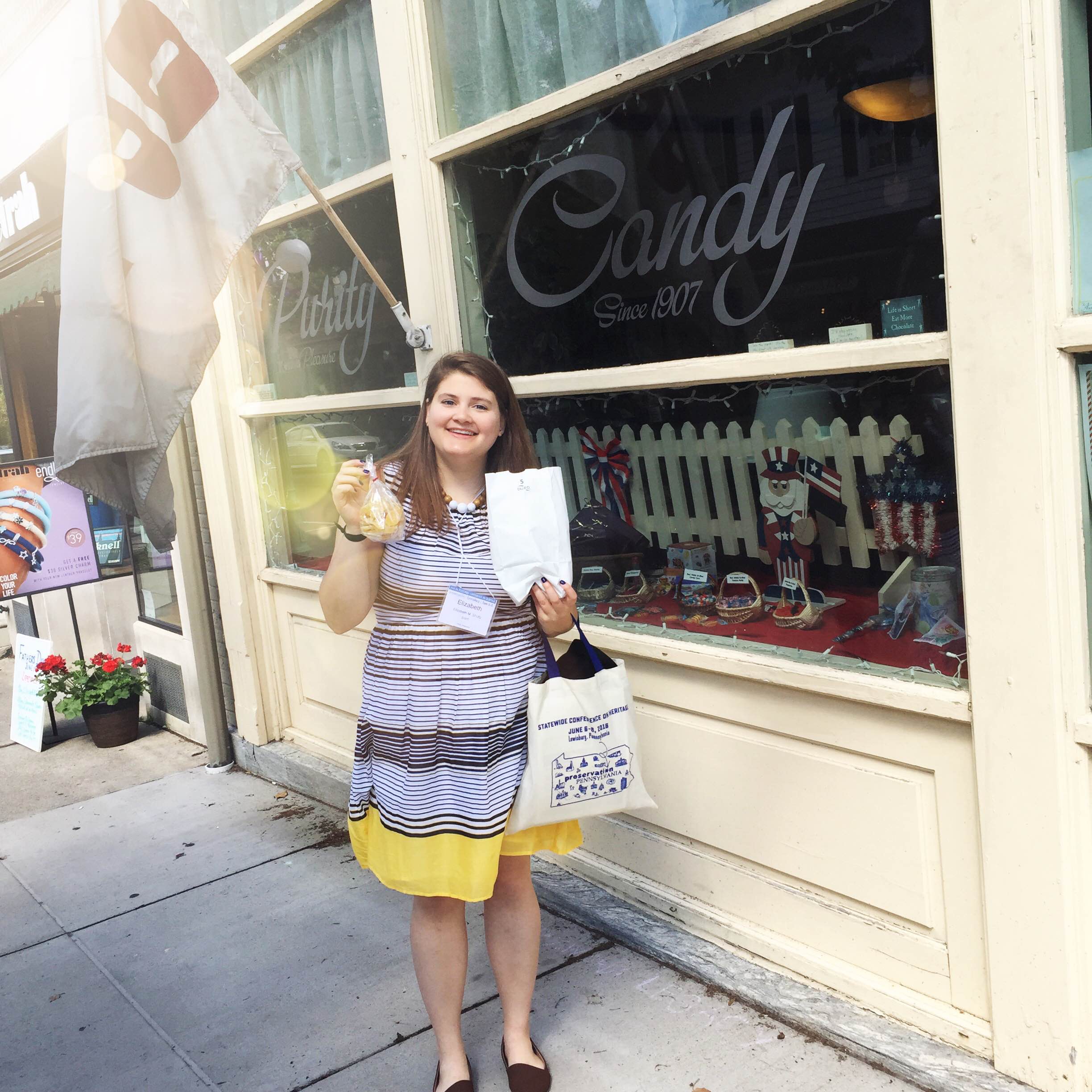 Elizabeth Shultz enjoying tome treats from Purity Candy, which opened on historic Market Street in Lewisburg, PA in 1907.