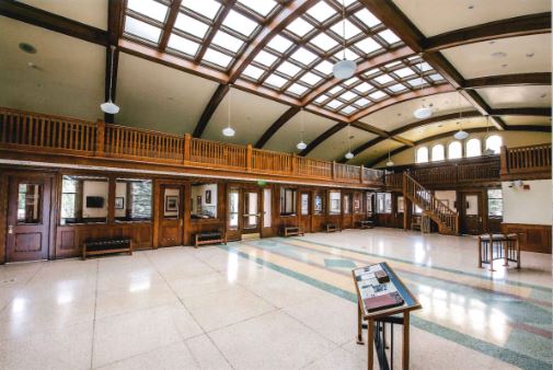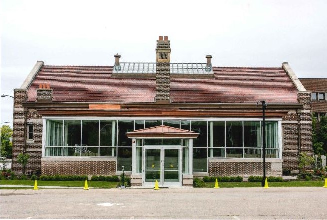 The building was designed by the Detroit firm of Donaldson & Meier Architects which specialized in commercial, education and religious buildings. The exterior is well-executed and consists of high quality brick, sandstone trim and frontispiece, arcaded gable end windows but the interior is the showpiece of the building. As shown in the historic photos below, Donaldson & Meier capitalized on the popularity of the Arts and Crafts movement by decorating the interior with an abundance of quarter sawn white oak woodwork (including beams, crown molding, brackets, wainscoting, office partitions and doors), a barrel vaulted ceiling with lay lights to flood the space with natural light and a glorious Grueby Faience Company tile fireplace and wood-framed inglenook that anchors the center of the space.