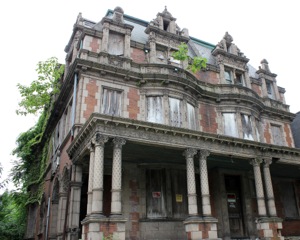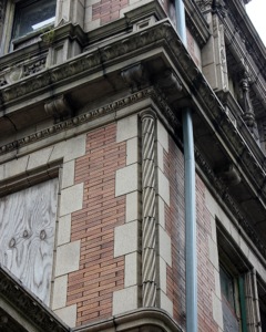 Vandals have torn off terracotta details and copper piping and even attempted to pry stained-glass windows out of the walls of the Conkling-Armstrong House. The roof has gaping holes. In one place on the second story, an addition has been removed and the opening covered with plywood.
