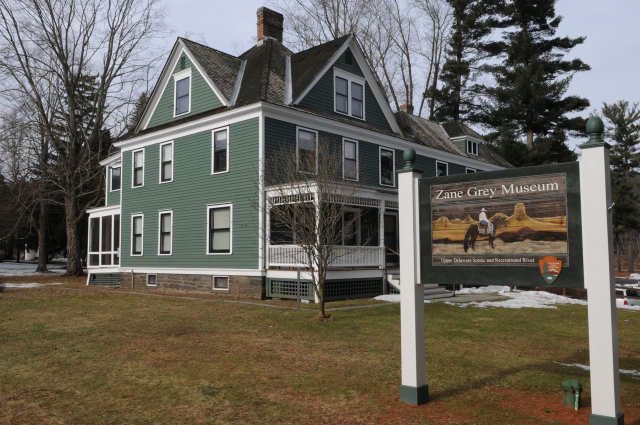 In 1989, the house as well as an extensive array of Grey’s memorabilia was acquired by the National Park Service, who continues to own and operate the property today. Several of the rooms are open to the public on the first floor, with office spaces for the Upper Delaware Scenic and Recreational River housed throughout. Visitors can also walk a short distance from the museum to Union Cemetery, where Zane Grey was buried upon his death in 1939, followed 18 years later by his wife, Lina Elise “Dolly” Roth. Today, the museum is open to the public from Memorial Day Weekend through Labor Day weekend.