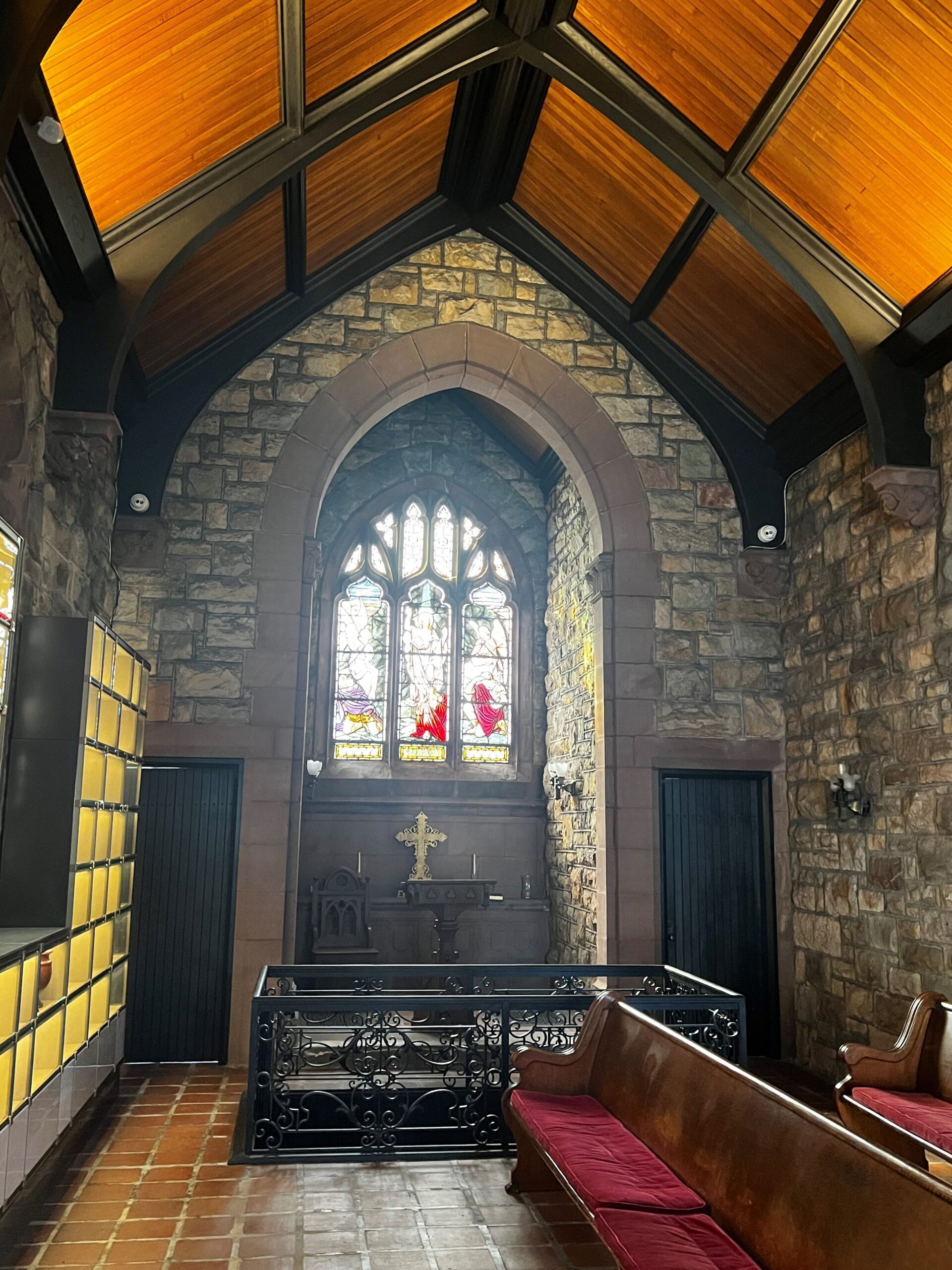 - The interior of the Memorial Chapel reflects its Gothic Revival design.