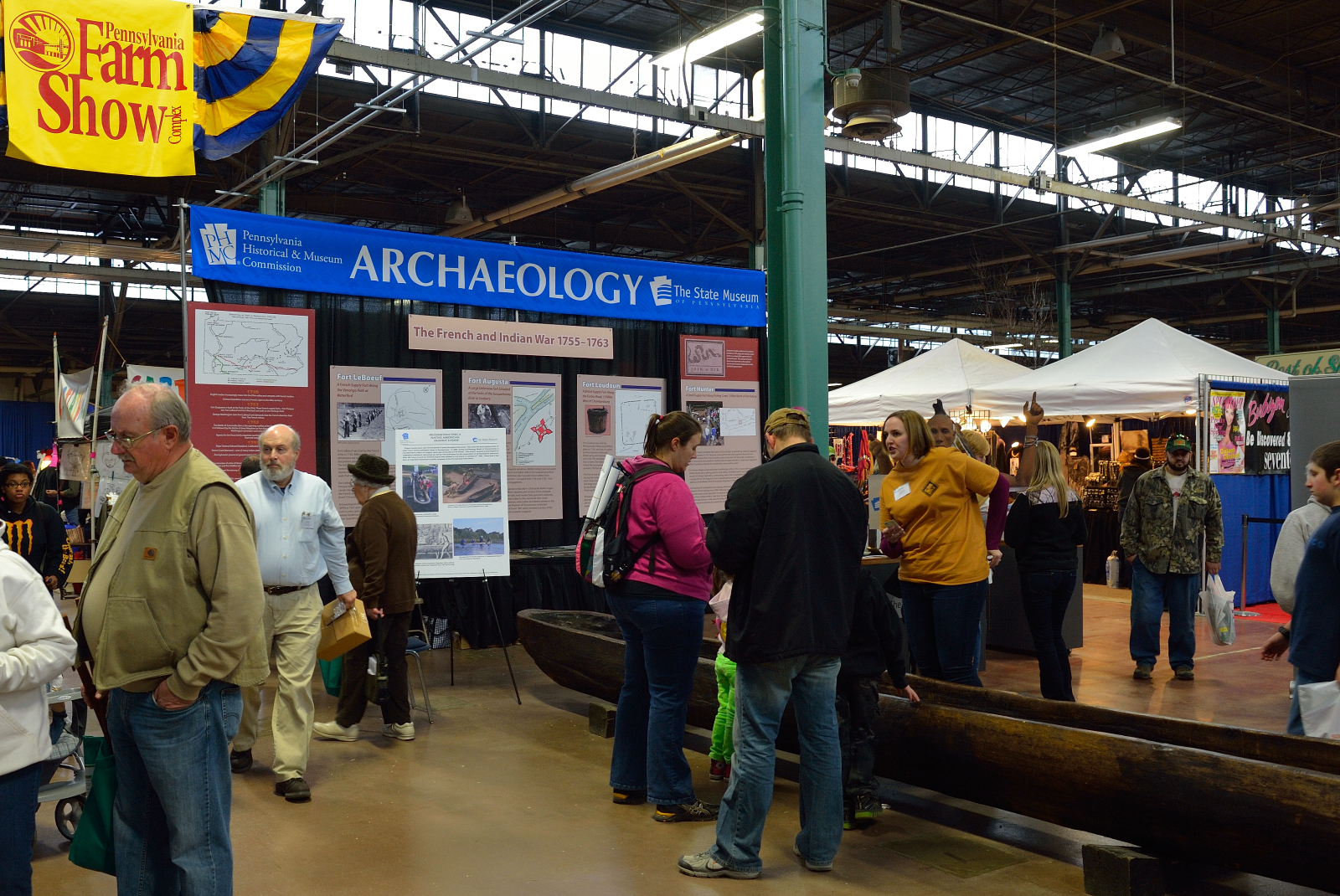 The cool weather this week has reminded many of us that fall is on its way and the warm days of summer will soon be behind us.  With the beginning of fall comes an abundance of public programs for archaeologists across the Commonwealth and especially for those employed at The State Museum of Pennsylvania. farm show 2013One might wonder why archaeologists with the State Museum are writing a blog for the Bureau for Historic Preservation, how are the two related?  Both of these entities are bureaus within the Pennsylvania Historical and Museum Commission (PHMC) and both are responsible for the protection and preservation of our archaeological resources. Archaeologists with the Bureau for Historic Preservation serve as the review agency for ground disturbing projects; their role is in protecting and preserving archaeological sites. Staff of the museum, preserve the archaeological resources recovered as the result of an archaeological investigation. Both of these bureaus play an important role in sharing our archaeological heritage with citizens of the Commonwealth and the archaeological community.