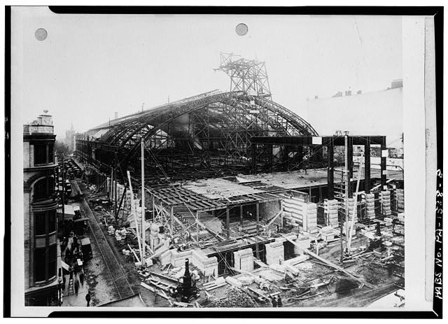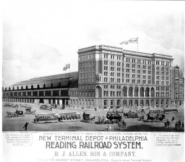 The tradition of farmers’ markets is a long standing one in Philadelphia dating from the city’s earliest days in the late 18th century. Informal markets for the sale of fish and produce were set up close to the Delaware River on Market Street (then called High Street) as early as 1680. The first permanent market house was constructed soon after at Market Street and 2nd Street. By 1809 the City had constructed open air market sheds in the middle of Market Street from 2nd Street to 6th Street. These sheds along Market Street were called “shambles” and provided little more than a roof and wooden tables, but they were heavily used until the city dismantled them in 1859 due to concerns about street traffic and sanitation. The tradition of open air markets continued in other parts of the city, such as the famous and still vibrant Italian Market along 9th Street in South Philadelphia. With the closing of the Market Street shambles, a new indoor market house, the Butcher’s and Farmers Market was constructed in 1860, close to the site of the current Reading Terminal Market. Another market house, the Franklin Market moved in next door in 1885. So, when plans were announced in 1890 for the Philadelphia and Reading Railroad to acquire that block of Market Street to build a large consolidated terminal, the market vendors refused to relocate. They negotiated a deal to have a new market constructed beneath the new train shed and tracks, the beginning of today’s Reading Terminal Market. As the magnificent new eight-story Italian Renaissance Revival style Philadelphia & Reading Railroad Terminal was being built along Market Street in 1891, an elaborate 95 foot tall train shed was being built just north of it with ample room for the market on the ground floor. The large train shed had a distinctive arched roof covering thirteen elevated tracks 25 feet above the ground. When the new Reading Terminal Market beneath those tracks opened in 1892, it had a state of the art basement refrigeration system and marble counters for all the vendor stalls.