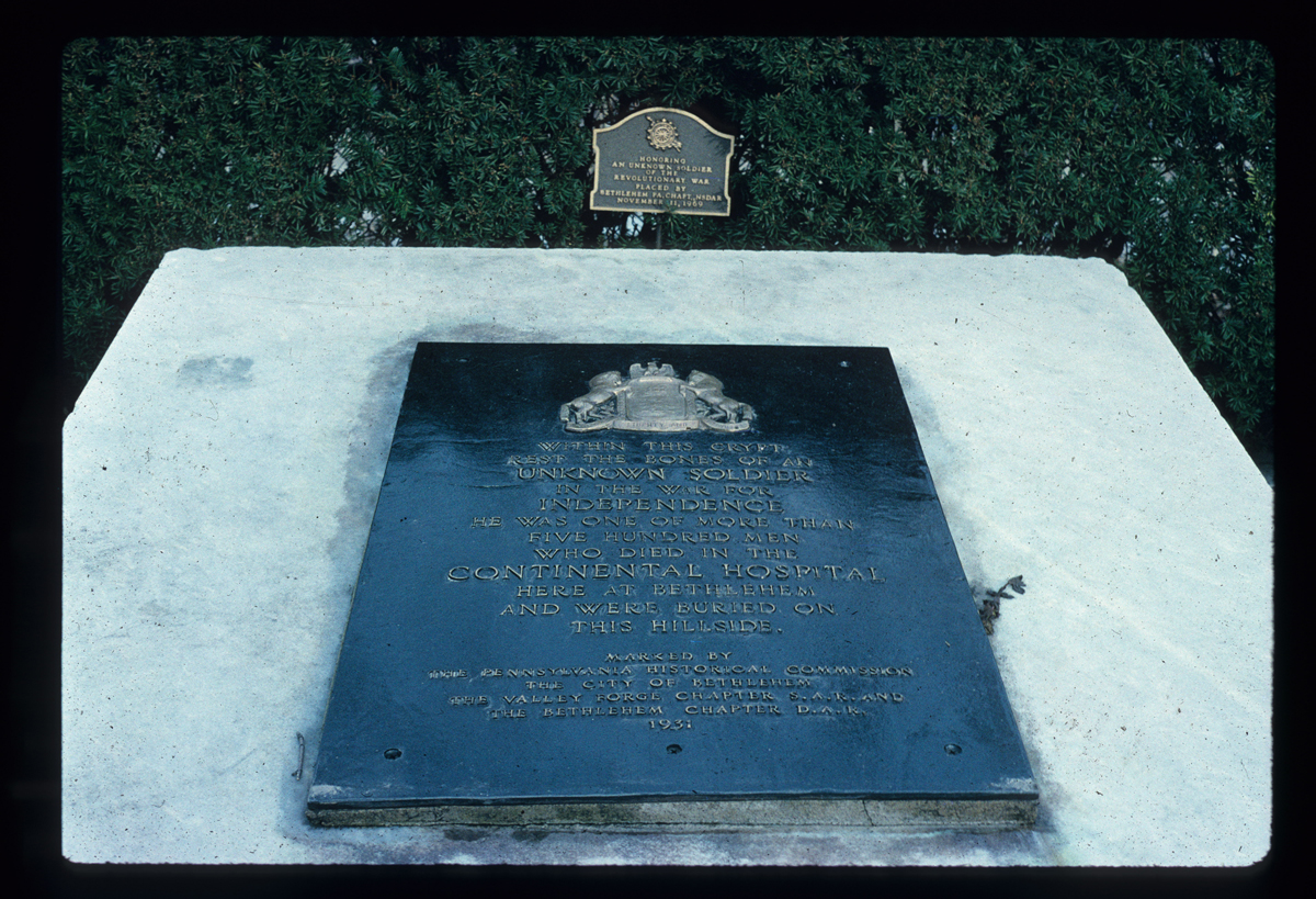 Within this crypt rest the bones of an Unknown Soldier in the War for Independence. He was one of more than 500 men who died in the Continental Hospital here at Bethlehem and were buried on this hillside.