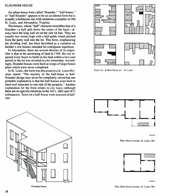 Another city which celebrates its flounder house heritage is St. Louis, Missouri. In 2015 The Cultural Resource Office of the City of St. Louis undertook a survey of flounder houses as a vernacular building type. Research showed that most of the 275 documented flounder houses were built between 1860 and 1890. The survey noted that many other flounder houses in St Louis have been lost to redevelopment and demolition. Founder houses in St. Louis are usually two and one-half stories in height and brick and built flush with the sidewalk.